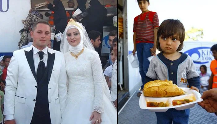 they turned their savings into thousands of warm meals for nearly 4,000 Syrian refugees living near the border. Dressed in wedding clothes, they personally served food with gentle smiles and open hearts.