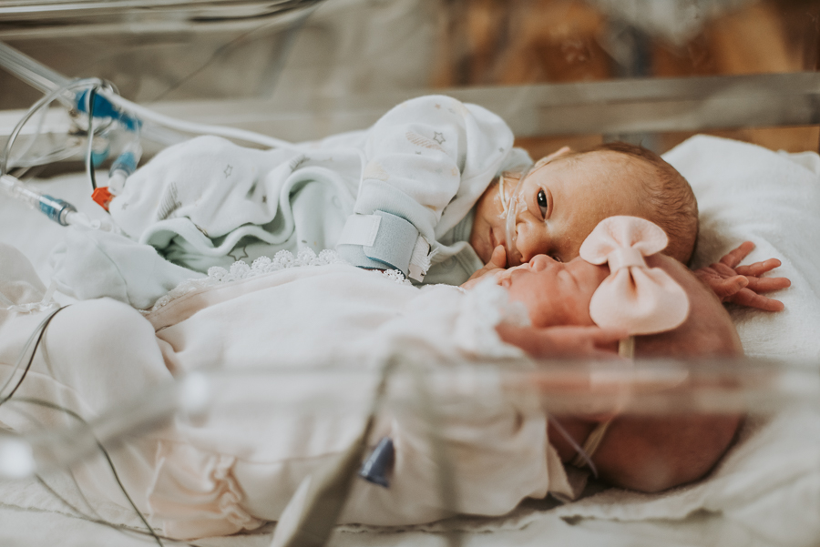 In the first, she’s glowing with quiet hope—counting down the days, dreaming of tiny hands and first cries. In the next, she’s in the NICU, gently holding her twins—fragile, perfect, real.