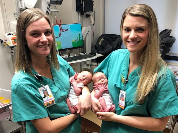Imagine the odds: Identical twin nurses walking into a delivery room to welcome identical twin baby girls.