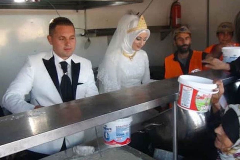 Imagine this: a bride in white lace, a groom in his finest suit… but instead of toasting with champagne among friends, they stand side by side serving hot meals to 4,000 weary Syrian refugees.