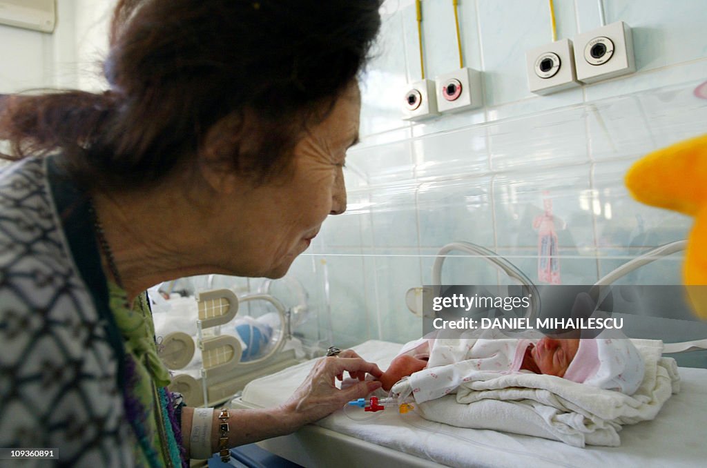 Adriana Iliescu looks at Eliza Maria, her newborn girl, at the intensive care department at the Giulesti Maternity Hospital in Bucharest, 20 January 2005. A 67-year-old Romanian woman Adriana Illescu, a retired university professor who had received fertility drugs for nine years before succeeding in becoming pregnant nine months ago, gave birth five weeks early to twin girls 16 January. Only one survived, however, weighing one and a half kilos (three pounds). Iliescu broke the record held by an Italian woman, who gave birth to a boy at the age of 62. Doctors had implanted the egg of of a young Italian woman which had been fertilized by her husband’s sperm. “Each person has a mission on earth. My mission was to prove that women who want to have children can do it,” Adriana Iliescu said at a press conference at the Giulesti maternity hospital in Bucharest. AFP PHOTO DANIEL MIHAILESCU (Photo credit should read DANIEL MIHAILESCU/AFP via Getty Images)