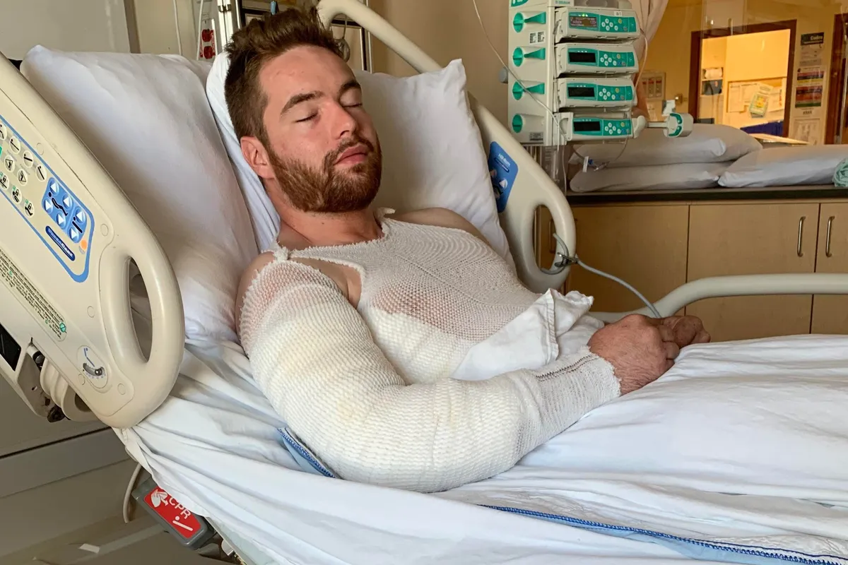 THE DIRECT CONNECTION: Doctors have bypassed portable units, connecting Hunter’s right arm directly to Wall Suction for maximum precision.