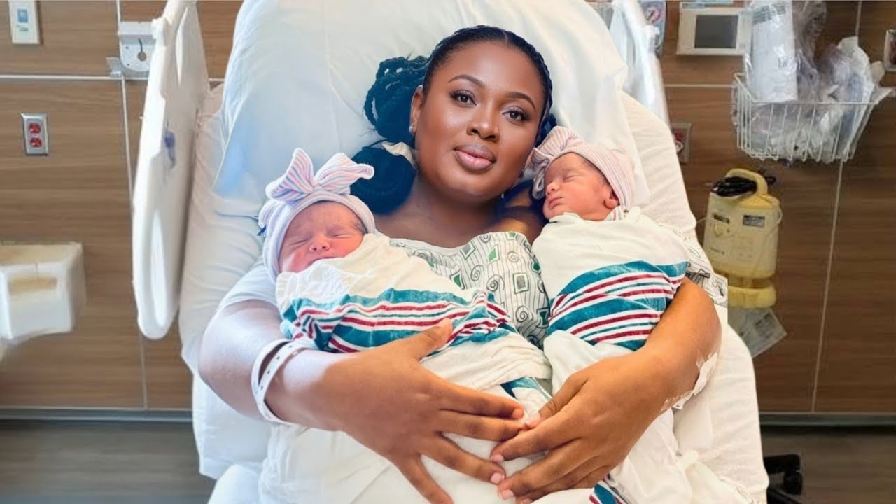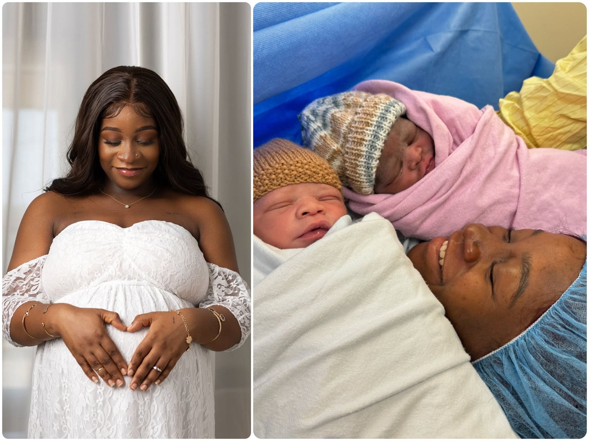 On the right, that pause has become a miracle. She lies in a hospital bed, holding her newborn twins , wrapped in warmth and love. Her smile now carries relief, pride, and overwhelming joy.