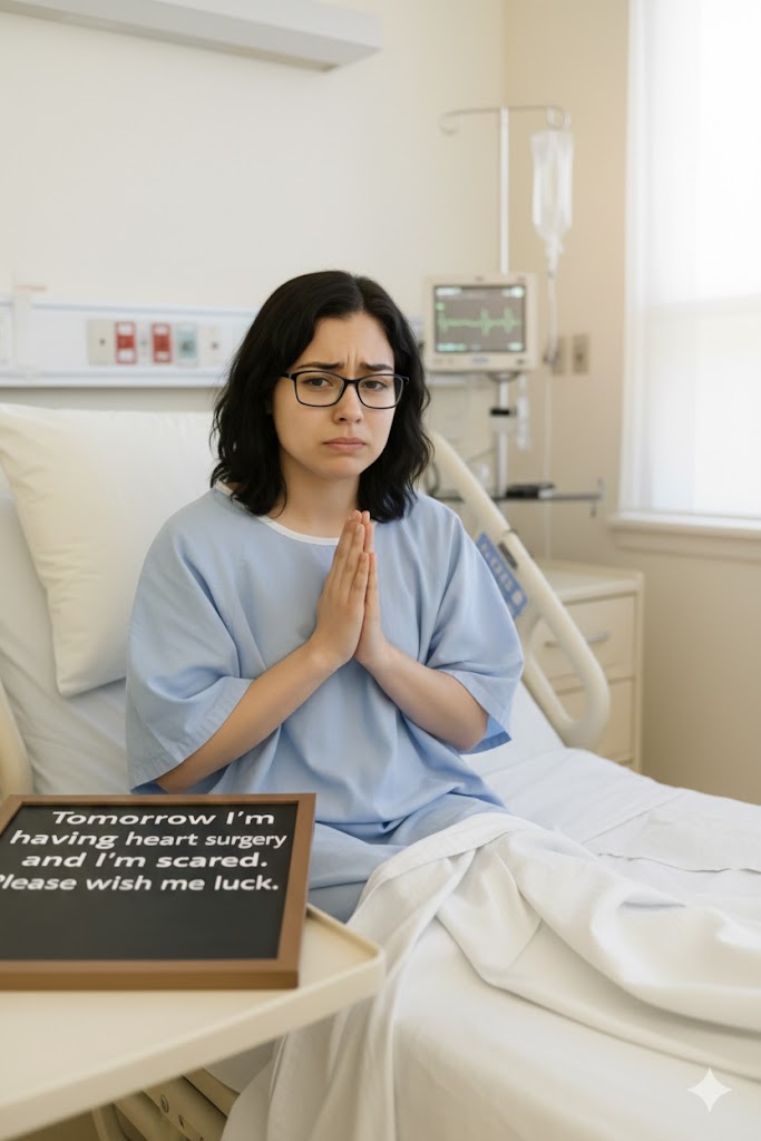 “Tomorrow is my heart surgery, and I’m scared. Please wish me luck.”   With these simple words, a young woman invites us into her most vulnerable moment.